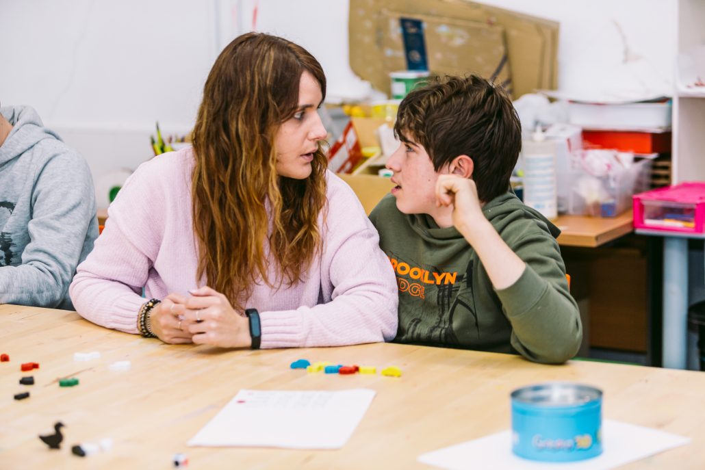 dos personas se miran de frente, sentadas en una mesa